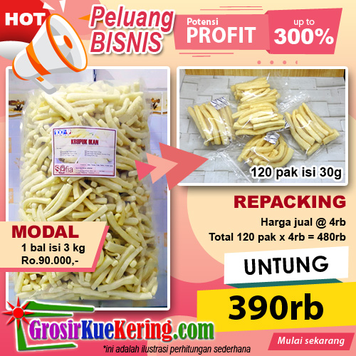 Kita ambil contoh krupuk stik ikan tengiri, yaitu 1 bal isi 3 kg dengan harga Rp.90.000,-.